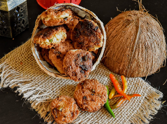 Maa used to make Chingri macher malaikari, the dish is based on jumbo shrimp or prawn and coconut milk. We had plenty of coconut in our house and maa never used store-bought coconut milk or coconut powder. After squeezing the milk from grated coconut maa used to make Narkoler bora (coconut fritters)with the leftover grated coconut. It is so delicious and tasty half of the rice I used to eat with it, though for making it you can use normal grated coconut. The recipe is simple, you need grated coconut, onion, green chilies. rice flour and gram flour and a pinch of salt. Mix it, fry it and you are ready to taste scrumptious tasty fritters on your way. It can eat as a snack or with hot steamed rice with green chilies.